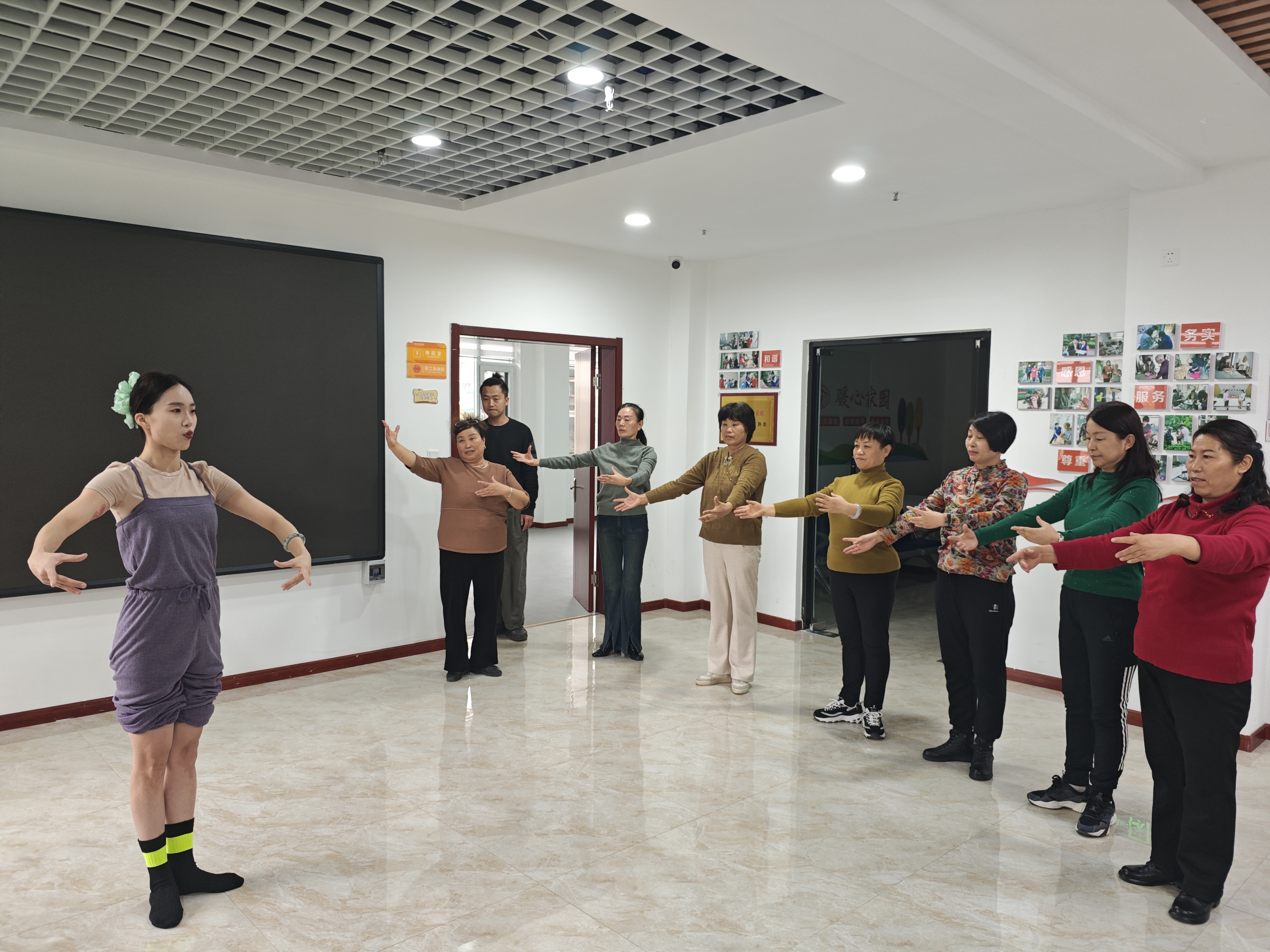 舞蹈课上,老师为大家示范了基本舞蹈站姿、舞步等简单易学的舞蹈动作,学员们个个精神饱满,专心揣摩每一个舞步和姿态,在欢快的音乐中反复练习,力求把每个动作做到完美。
